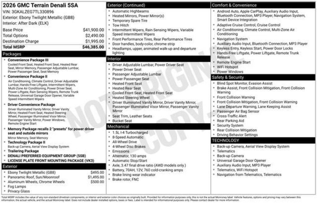 Recent Arrival! ***** Clean CARFAX *****2026 GMC TERRAIN DENALI AWD*****The 2026 GMC Terrain Denali is a sophisticated and capable SUV that offers a premium driving experience. With its sleek black exterior and a host of advanced features, this vehicle is designed to elevate your everyday commute and weekend adventures.- Panoramic sunroof with sunshade- 20 After Midnight machined-face aluminum wheels- Wireless Apple CarPlay/Android AutoSlip into the driver's seat and you'll be greeted by a spacious and well-appointed cabin. The Denali trim level brings an array of premium touches, including perforated leather-appointed seating, heated and ventilated front seats, and a heated steering wheel. The 8-way power driver's seat with memory function ensures you'll always find your perfect driving position.Under the hood, the Terrain Denali is powered by a 1.5L DOHC engine paired with an 8-speed automatic transmission and all-wheel drive. This combination delivers a smooth and responsive ride, while also achieving an impressive 24 city/26 highway MPG.The advanced technology features in this Terrain Denali are designed to keep you connected and in control. Enjoy the convenience of the Premium GMC Infotainment System, complete with navigation, as well as the peace of mind provided by the OnStar and GMC connected services.Safety is also a top priority, with a host of advanced driver-assistance technologies, including forward collision alert, lane keep assist, and automatic emergency braking. You can drive with confidence, knowing that your Terrain Denali is equipped to help keep you and your passengers safe.Whether you're navigating the city streets or exploring the open road, the 2026 GMC Terrain Denali is a remarkable SUV that combines style, performance, and technology. Experience the difference for yourself visit our showroom and take this exceptional vehicle for a test drive.All vehicles are one of each. All Pre-Owned or Certified vehicles are Used. The offering price of this vehicle is conditioned on a negotiated waiver of implied warranties if the Buyers Guide on the vehicle is AS IS-NO DEALER WARRANTY. If the Buyers Guide on the vehicle is IMPLIED WARRANTIES ONLY, the offering price includes implied warranties. A dealer documentary service fee of up to $200 may be added to the sale price or capitalized cost. All financing is subject to credit approval. Prices exclude tax, title, and license and are valid for Washington residents only. All transactions are negotiable including price, trade allowance, interest rate (of which the dealer may retain a portion), term, and documentary service fee. Any agreement is subject to execution of contract documents. Every reasonable effort is made to ensure the accuracy of this data. Please verify any information in question with a dealership sales representative.