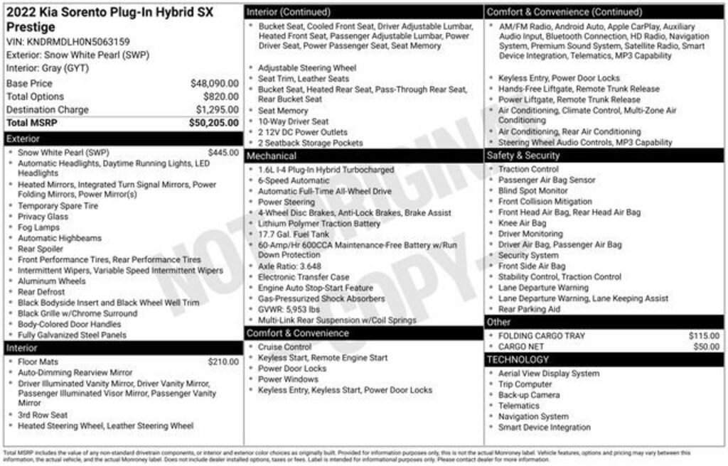 Recent Arrival! Clean CARFAX*****Experience the perfect blend of power, efficiency, and style with the 2022 Kia Sorento Plug-In Hybrid SX Prestige. This exceptional SUV is the ultimate companion for your adventures, offering a seamless combination of cutting-edge technology, premium comfort, and uncompromising performance.- Carpeted Floor Mats- Cargo Net- Folding Cargo Tray- Snow White PearlBeneath the sleek exterior lies a remarkable powertrain that delivers an exhilarating driving experience. The 1.6L I4 DGI Hybrid Turbocharged DOHC 16V LEV3-ULEV70 engine, paired with a 6-Speed Automatic transmission and All-Wheel Drive, provides the perfect balance of power and efficiency. Indulge in the seamless acceleration and responsive handling that will have you eagerly anticipating every twist and turn.Step inside the Sorento Plug-In Hybrid SX Prestige and be enveloped in a world of unparalleled luxury and convenience. The 10.25 Touchscreen Navigation system with SiriusXM keeps you connected and entertained, while the Genuine Perforated Leather Seat Trim and Heated & Ventilated Front Bucket Seats offer unmatched comfort. The Smart Key with Push Button and Remote Start ensures your commute is effortless, and the Power Liftgate provides easy access to the spacious cargo area.Safety is of the utmost importance, and the Sorento Plug-In Hybrid SX Prestige delivers with a comprehensive suite of advanced driver assistance features. Enjoy the peace of mind of ABS brakes, Dual Front Impact Airbags, Dual Front Side Impact Airbags, and Occupant Sensing Airbag, all working together to protect you and your loved ones.Whether you're embarking on a family road trip or navigating the daily commute, the 2022 Kia Sorento Plug-In Hybrid SX Prestige is the perfect companion. Experience the perfect blend of power, efficiency, and sophistication that will elevate your driving experience to new heights.All vehicles are one of each. All Pre-Owned or Certified vehicles are Used. The offering price of this vehicle is conditioned on a negotiated waiver of implied warranties if the Buyers Guide on the vehicle is AS IS-NO DEALER WARRANTY. If the Buyers Guide on the vehicle is IMPLIED WARRANTIES ONLY, the offering price includes implied warranties. A dealer documentary service fee of up to $200 may be added to the sale price or capitalized cost. All financing is subject to credit approval. Prices exclude tax, title, and license and are valid for Washington residents only. All transactions are negotiable including price, trade allowance, interest rate (of which the dealer may retain a portion), term, and documentary service fee. Any agreement is subject to execution of contract documents. Every reasonable effort is made to ensure the accuracy of this data. Please verify any information in question with a dealership sales representative.